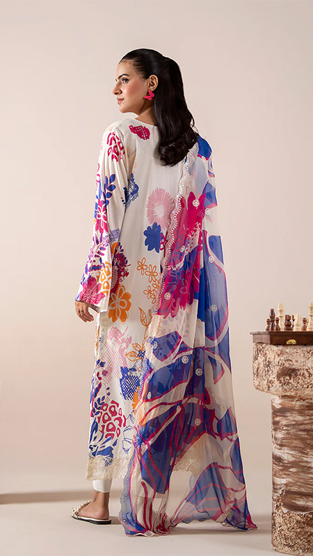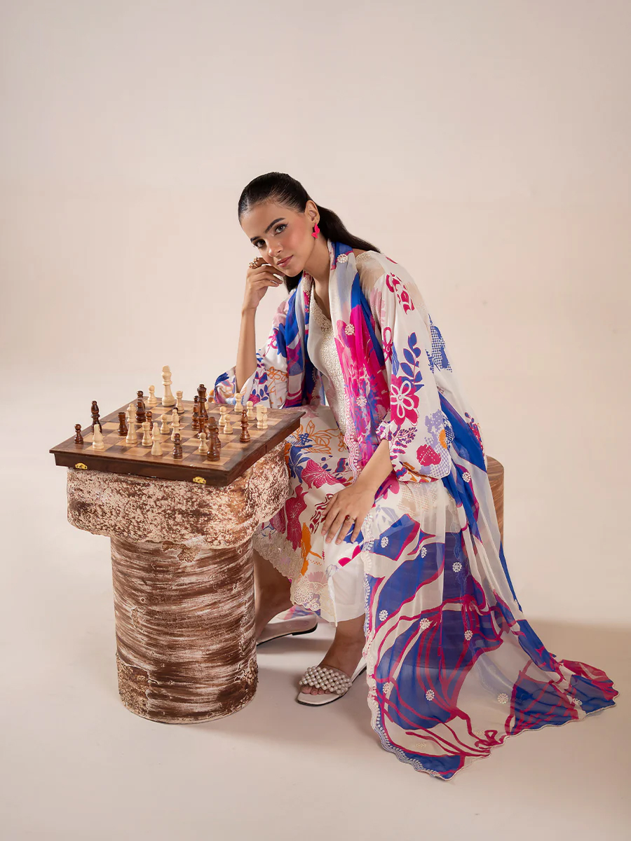Dupatta: Digital Printed Bamber Chiffon Sequin Embroidered Cut-work